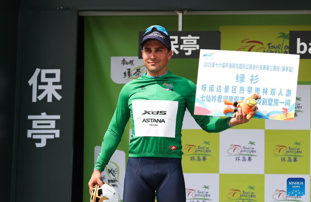 Matteo Malucelli of XDS Astana Team celebrates in the green jersey during the awarding ceremony after Stage 3 at the 16th Tour of Hainan cycling race from Lingshui to Baoting, south China's Hainan Province, April 9, 2025. (Xinhua/Yang Guanyu)