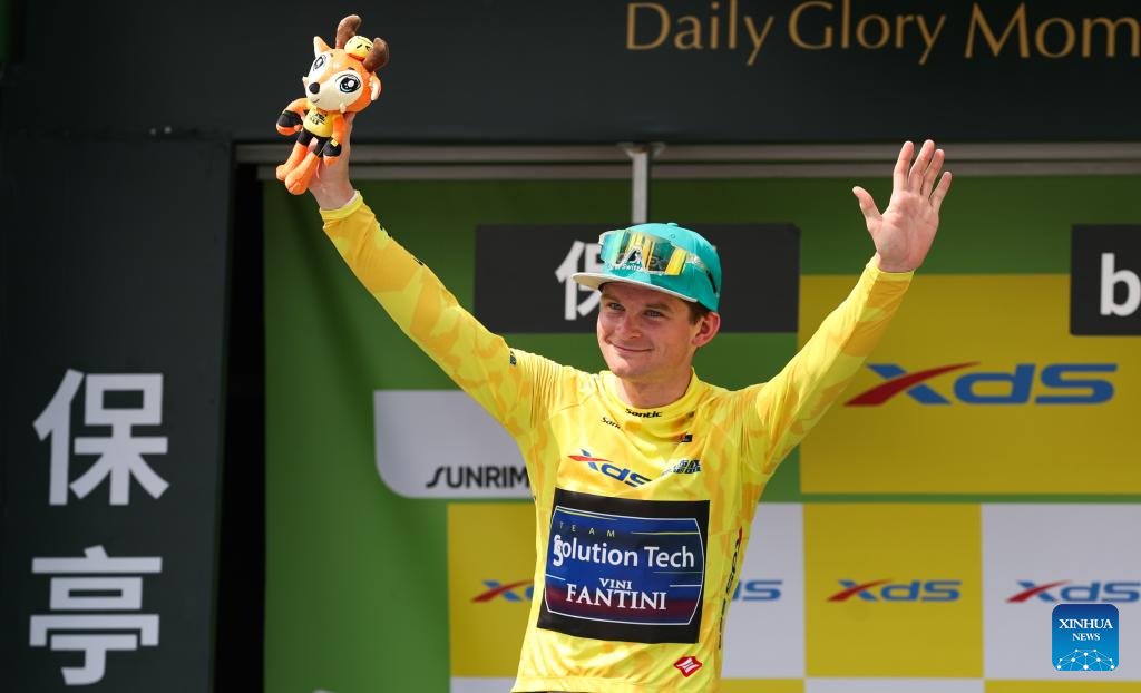 Kyrylo Tsarenko of Solution Tech Vini Fantini celebrates in the yellow jersey during the awarding ceremony after Stage 3 at the 16th Tour of Hainan cycling race from Lingshui to Baoting, south China's Hainan Province, April 9, 2025. (Xinhua/Yang Guanyu)