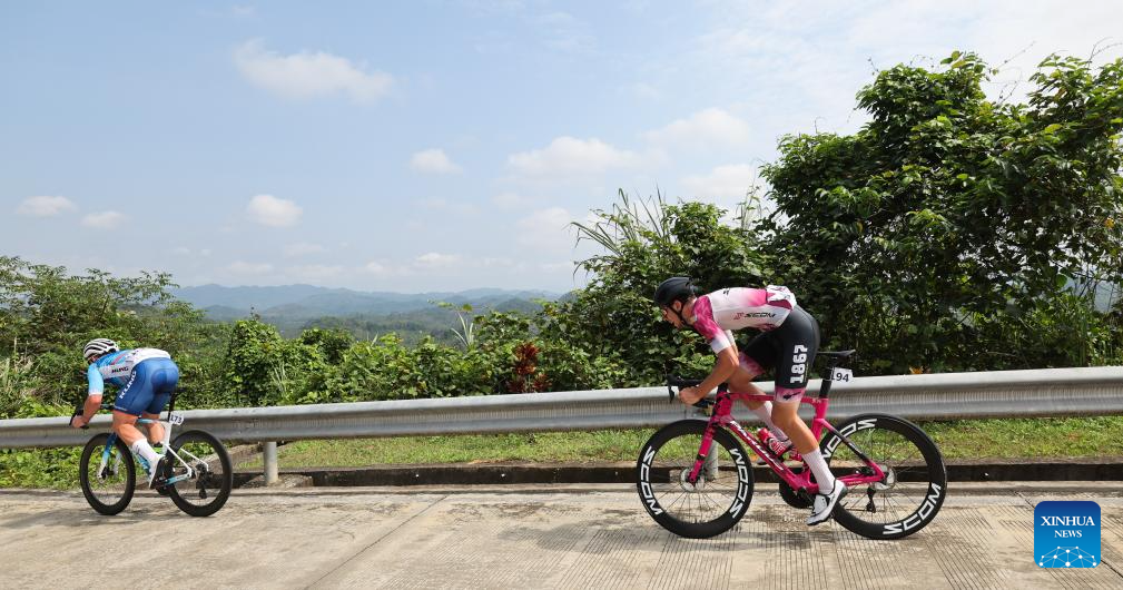 Redmond Connolly (R) of Wuzhishan SCOM MVMT Cycling Team competes during Stage 3 at the 16th Tour of Hainan cycling race from Lingshui to Baoting, south China's Hainan Province, April 9, 2025. (Xinhua/Yang Guanyu)