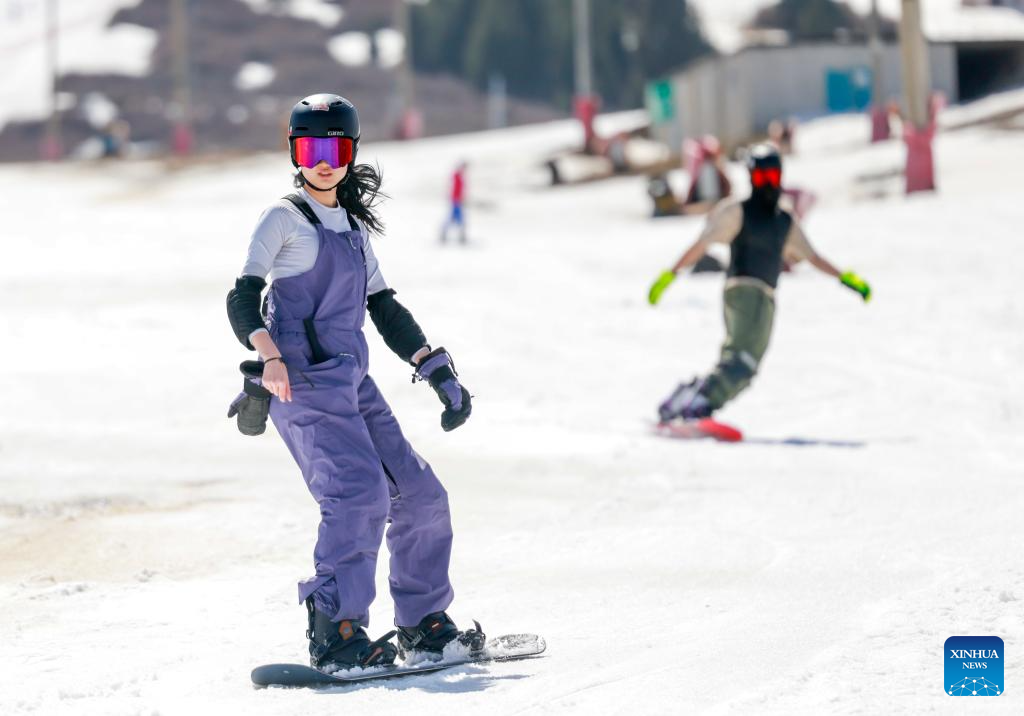 Tourists ski in Urumqi, northwest China's Xinjiang Uygur Autonomous Region, April 5, 2025. In recent years, with the abundant ice and snow resources of the Altay and Tianshan Mountains, Xinjiang are drawing increasing numbers of skiers and snowboarders, driven by China's expanding winter sports industry and ice-and-snow economy. A number of high-grade ski resorts have been constructed, attracting a large number of domestic and international tourists and gradually transforming ice and snow resources into economic benefits. (Xinhua/Wang Fei)