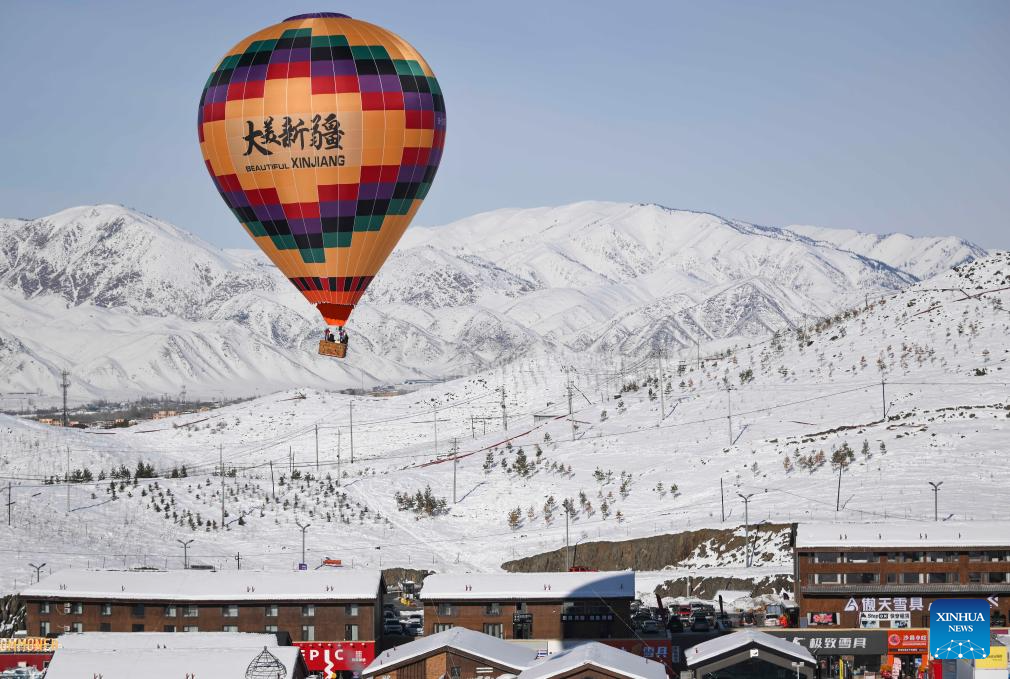 Tourists take a hot air balloon at Jiangjunshan International Ski Resort in Altay, northwest China's Xinjiang Uygur Autonomous Region, Jan. 25, 2025. In recent years, with the abundant ice and snow resources of the Altay and Tianshan Mountains, Xinjiang are drawing increasing numbers of skiers and snowboarders, driven by China's expanding winter sports industry and ice-and-snow economy. A number of high-grade ski resorts have been constructed, attracting a large number of domestic and international tourists and gradually transforming ice and snow resources into economic benefits. (Xinhua/Hu Huhu)