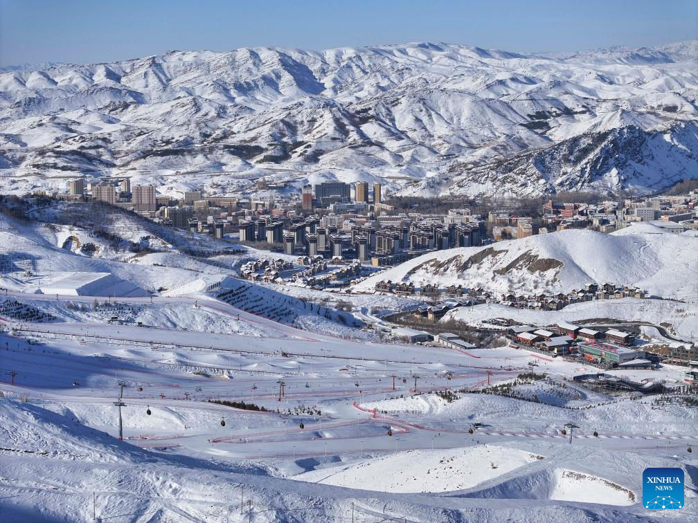 An aerial photo taken on Jan. 24, 2025 shows a view of Jiangjunshan International Ski Resort in Altay Prefecture, northwest China's Xinjiang Uygur Autonomous Region. In recent years, with the abundant ice and snow resources of the Altay and Tianshan Mountains, Xinjiang are drawing increasing numbers of skiers and snowboarders, driven by China's expanding winter sports industry and ice-and-snow economy. A number of high-grade ski resorts have been constructed, attracting a large number of domestic and international tourists and gradually transforming ice and snow resources into economic benefits. (Xinhua/Hu Huhu)