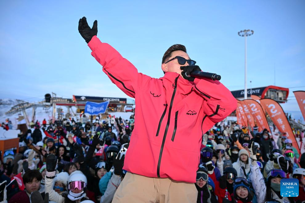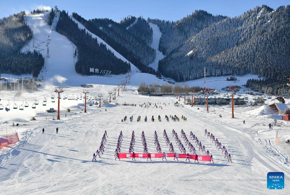 Skiers perform during the opening ceremony for the 2024-2025 ski season in Urumqi, northwest China's Xinjiang Uygur Autonomous Region, Nov. 24, 2024. In recent years, with the abundant ice and snow resources of the Altay and Tianshan Mountains, Xinjiang are drawing increasing numbers of skiers and snowboarders, driven by China's expanding winter sports industry and ice-and-snow economy. A number of high-grade ski resorts have been constructed, attracting a large number of domestic and international tourists and gradually transforming ice and snow resources into economic benefits. (Xinhua/Hu Huhu)