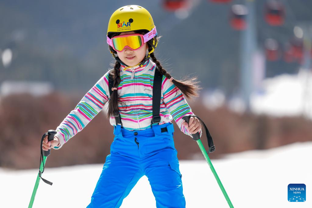 A child skis in Urumqi, northwest China's Xinjiang Uygur Autonomous Region, April 5, 2025. In recent years, with the abundant ice and snow resources of the Altay and Tianshan Mountains, Xinjiang are drawing increasing numbers of skiers and snowboarders, driven by China's expanding winter sports industry and ice-and-snow economy. A number of high-grade ski resorts have been constructed, attracting a large number of domestic and international tourists and gradually transforming ice and snow resources into economic benefits. (Xinhua/Wang Fei)