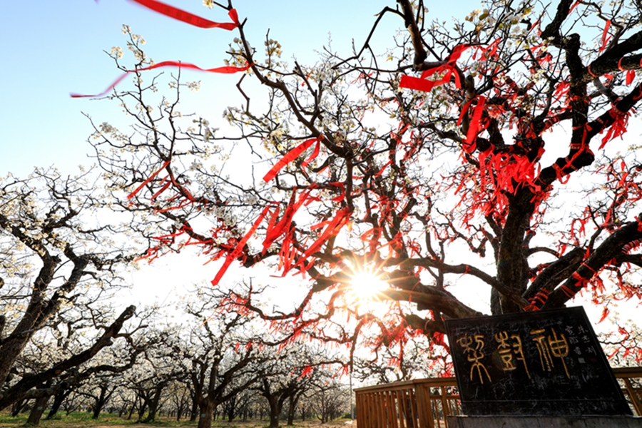 Cloth strips are hung in the tree to pray for good fortune in a pear orchard in Dangshan county, east China's Anhui Province. (People's Daily Online/Zhang Jun)