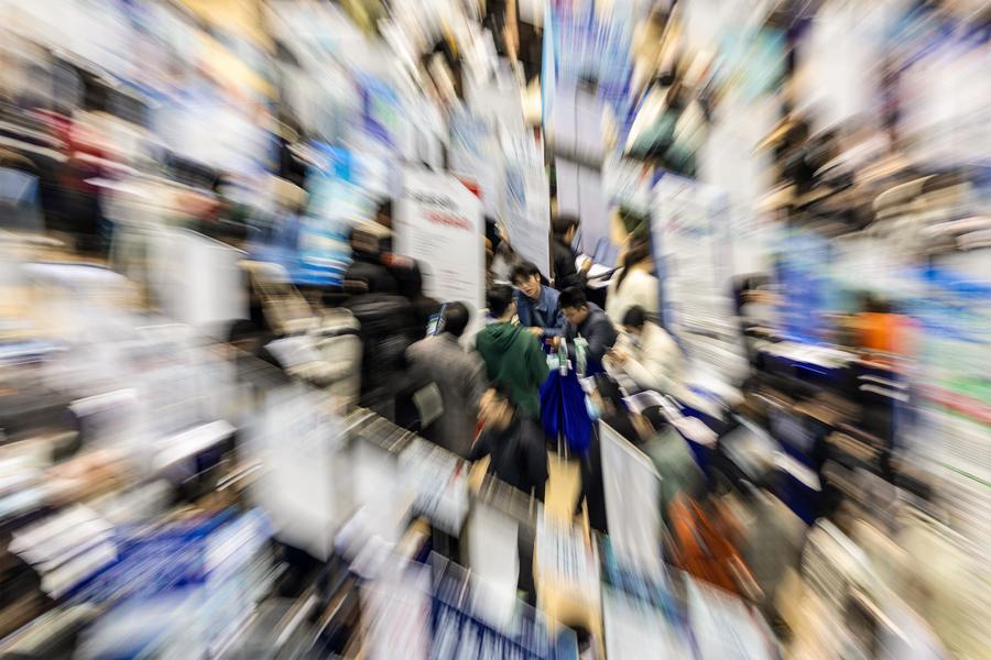 Students learn about employment information at a job fair held at Harbin Institute of Technology in Harbin, northeast China's Heilongjiang Province, March 26, 2025. (Xinhua/Zhang Tao)