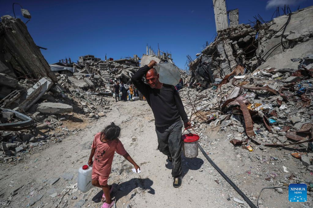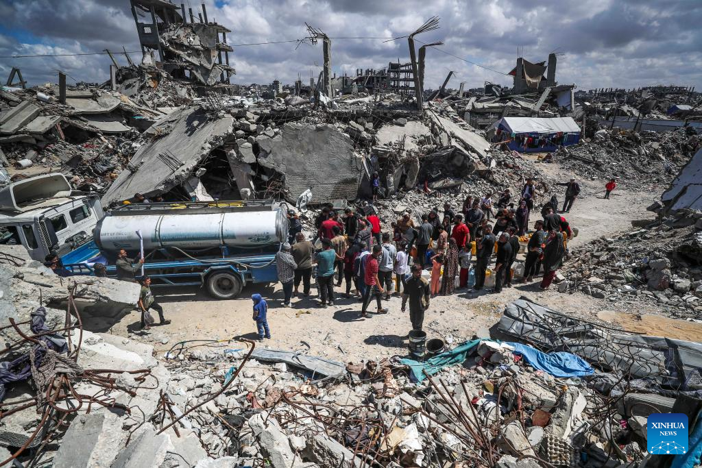 Displaced Palestinians fetch water in Jabalia refugee camp in the northern Gaza Strip, on April 10, 2025. Across Gaza, the UN Office for the Coordination of Humanitarian Affairs (OCHA) said its partners are warning of acute water shortages in shelters hosting displaced people. The loss of water, the lack of cleaning supplies and cohabitation with livestock are having a dire public health impact. In March, more than one-third of households in Gaza experienced lice infestations. (Photo by Mahmoud Zaki/Xinhua)
