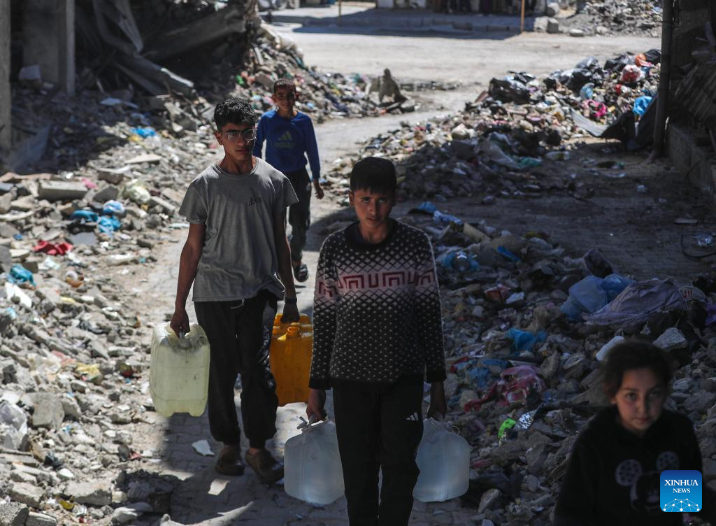A displaced Palestinian boy fetches water in Jabalia refugee camp in the northern Gaza Strip, on April 10, 2025. Across Gaza, the UN Office for the Coordination of Humanitarian Affairs (OCHA) said its partners are warning of acute water shortages in shelters hosting displaced people. The loss of water, the lack of cleaning supplies and cohabitation with livestock are having a dire public health impact. In March, more than one-third of households in Gaza experienced lice infestations. (Photo by Mahmoud Zaki/Xinhua)