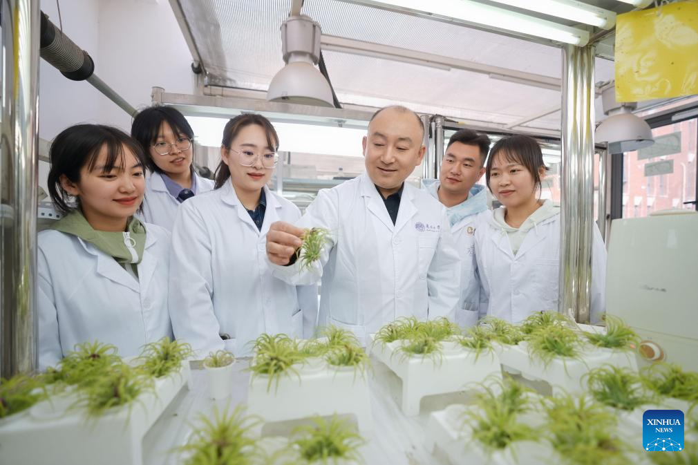 Researchers from Nankai University's College of Environmental Science and Engineering conduct a plant simulation exposure experiment at Nankai University in Tianjin, north China, on April 9, 2025. (Nankai University/Handout via Xinhua)