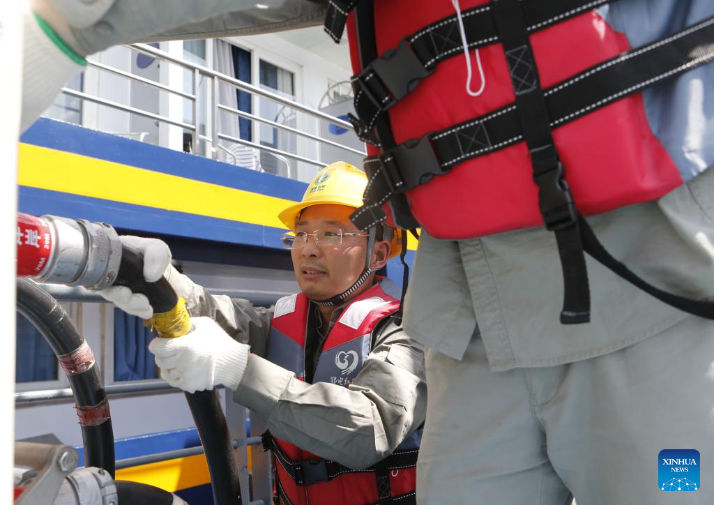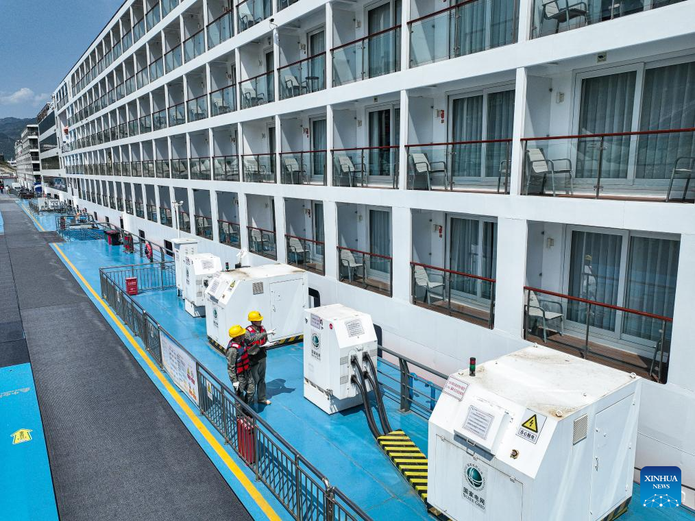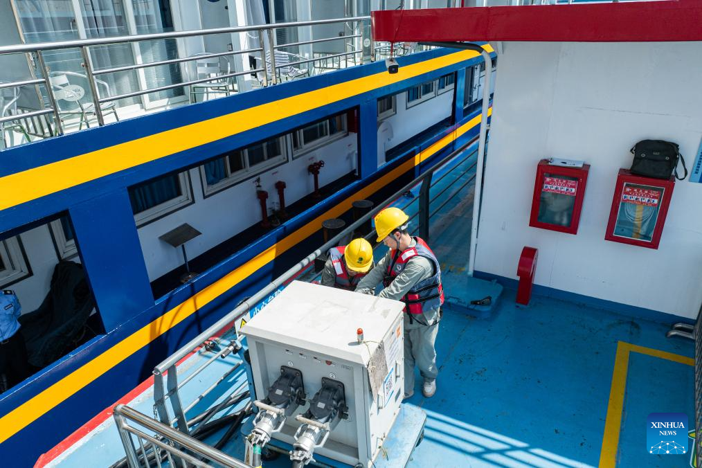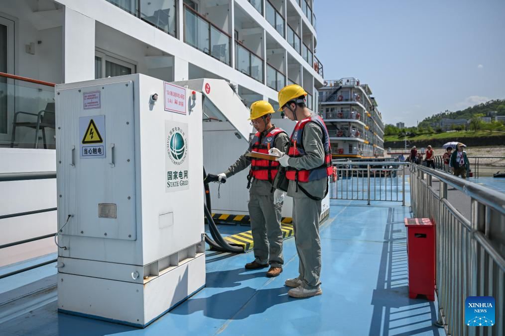 Staff members of the State Grid Yichang Power Supply Company inspect shore power facilities at Zigui port in Yichang City, central China's Hubei Province, April 10, 2025. In recent years, (Xinhua/Du Zixuan)
