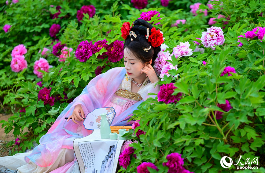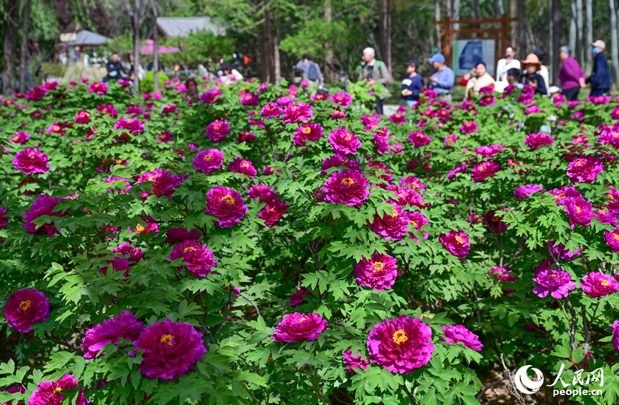 Tourists pose for pictures with blooming peony flowers in Luoyang, central China's Henan Province. (People's Daily Online/Huo Yaping)