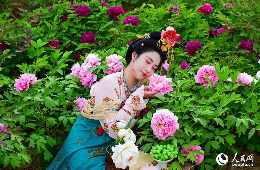 A tourist poses for a picture with blooming peony flowers in Luoyang, central China's Henan Province. (People's Daily Online/Huo Yaping)