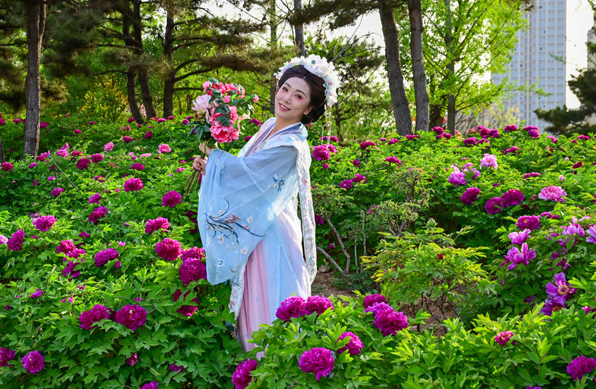A tourist poses for a picture with blooming peony flowers in Luoyang, central China's Henan Province. (Photo/Li Weichao)