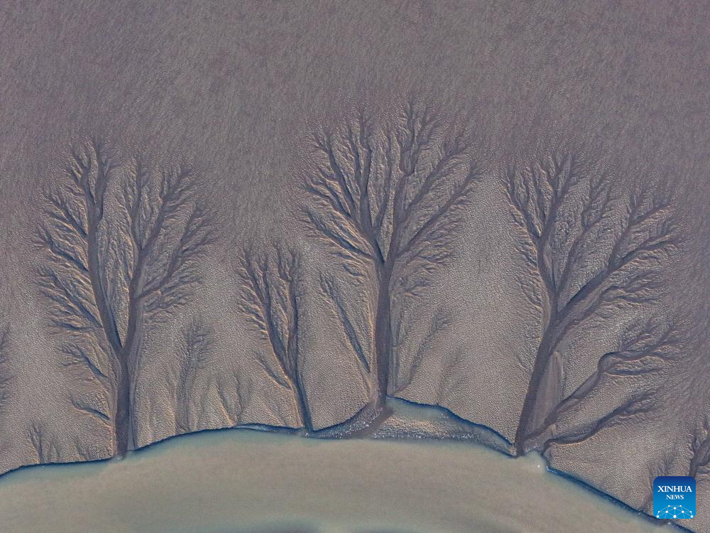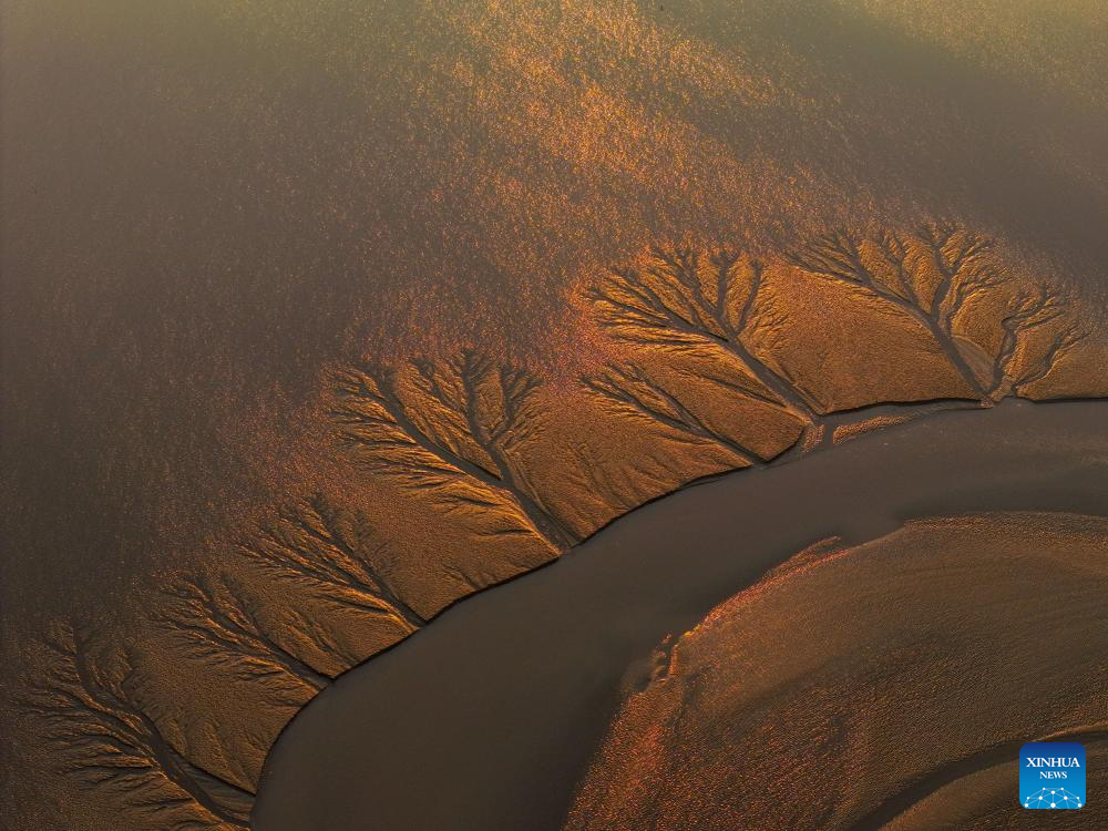 An aerial drone photo taken on Oct. 29, 2024 shows a view of the tidal flat at the Tiaozini wetland in Dongtai of Yancheng, east China's Jiangsu Province. Yancheng, located in the middle part of the coastline of Jiangsu Province, is named after the meaning of "city surrounded by salt fields". In recent years, Yancheng has strived to shape a green and livable city through various efforts. (Xinhua/Li Bo)