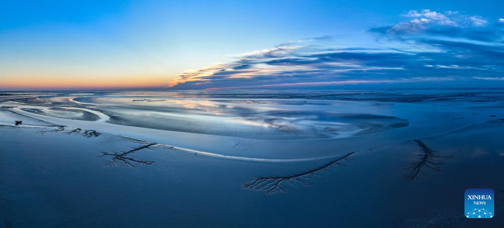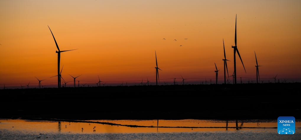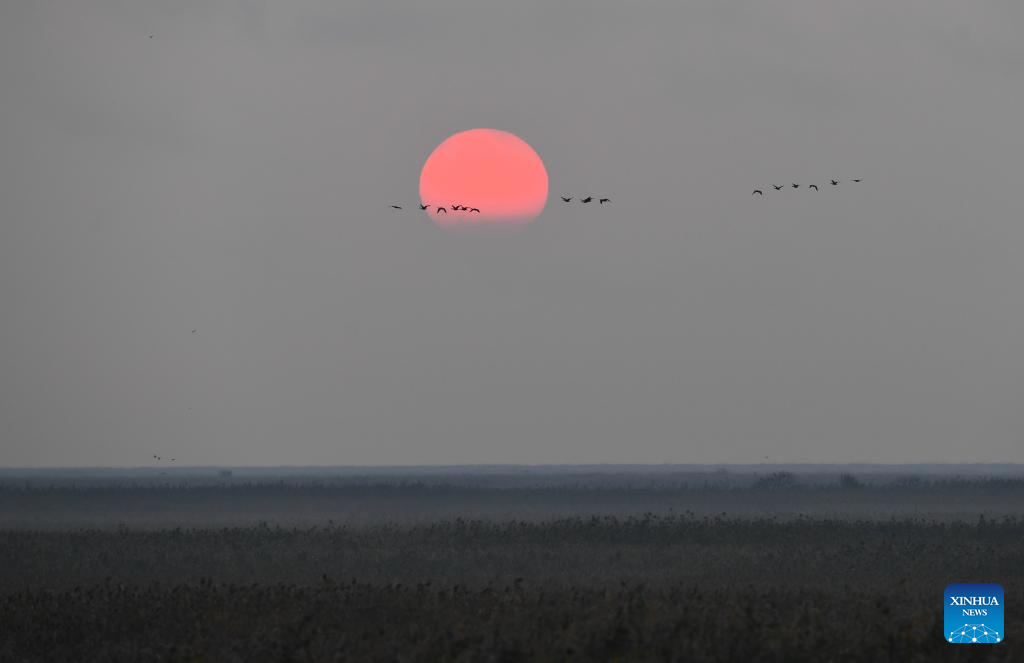 This photo taken on Nov. 8, 2022 shows the sunrise scenery at Jiangsu Yancheng Wetland and Rare Birds National Nature Reserve in Yancheng, east China's Jiangsu Province. Yancheng, located in the middle part of the coastline of Jiangsu Province, is named after the meaning of "city surrounded by salt fields". In recent years, Yancheng has strived to shape a green and livable city through various efforts. (Xinhua/Ji Chunpeng)