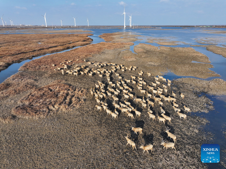 An aerial drone photo shows milu deer in Yancheng, east China's Jiangsu Province, Dec. 21, 2024. Yancheng, located in the middle part of the coastline of Jiangsu Province, is named after the meaning of "city surrounded by salt fields". In recent years, Yancheng has strived to shape a green and livable city through various efforts. (Xinhua/Ji Chunpeng)