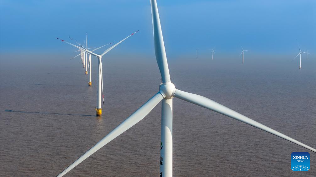 An aerial drone photo taken on Jan. 11, 2025 shows an offshore wind farm near the coast of Yancheng, east China's Jiangsu Province. Yancheng, located in the middle part of the coastline of Jiangsu Province, is named after the meaning of "city surrounded by salt fields". In recent years, Yancheng has strived to shape a green and livable city through various efforts. (Photo by Wang Yan/Xinhua)