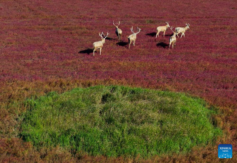 An aerial drone photo taken on Oct. 29, 2024 shows milu deer at the Tiaozini wetland in Dongtai of Yancheng, east China's Jiangsu Province. Yancheng, located in the middle part of the coastline of Jiangsu Province, is named after the meaning of "city surrounded by salt fields". In recent years, Yancheng has strived to shape a green and livable city through various efforts. (Xinhua/Li Bo)