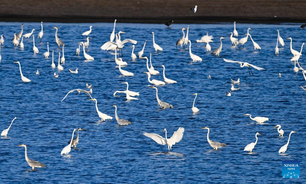 Birds are pictured at the Tiaozini wetland in Dongtai of Yancheng, east China's Jiangsu Province, Aug. 20, 2023. Yancheng, located in the middle part of the coastline of Jiangsu Province, is named after the meaning of "city surrounded by salt fields". In recent years, Yancheng has strived to shape a green and livable city through various efforts. (Xinhua/Ji Chunpeng)