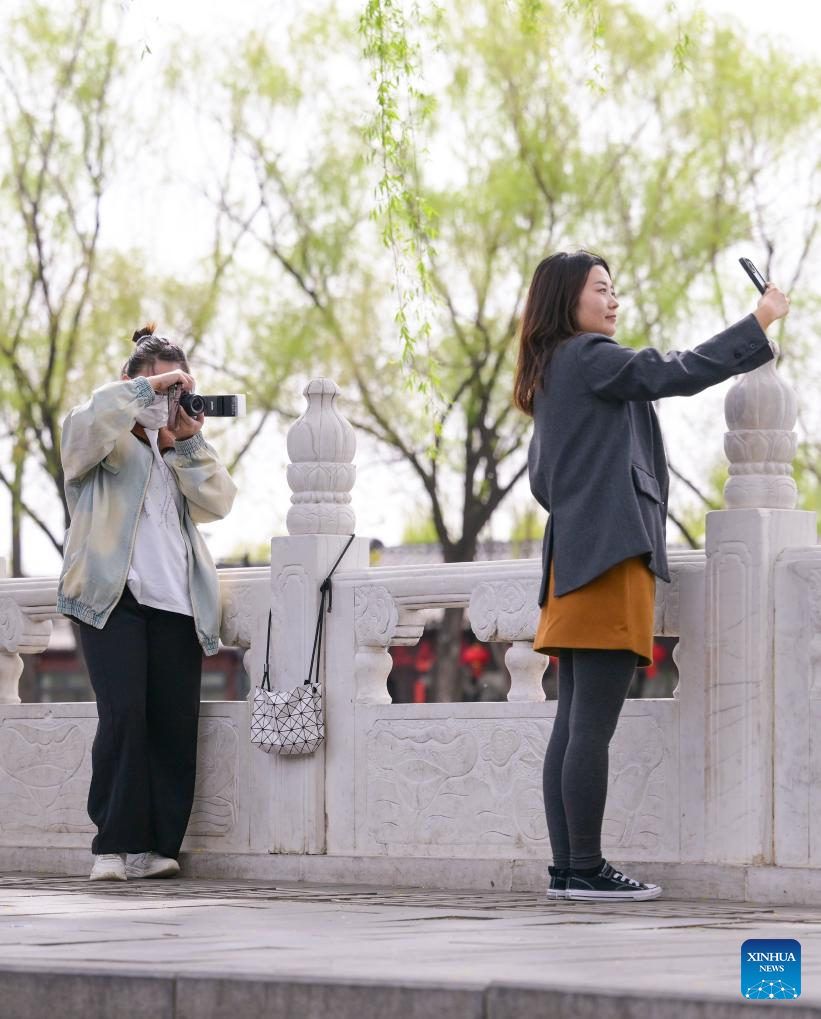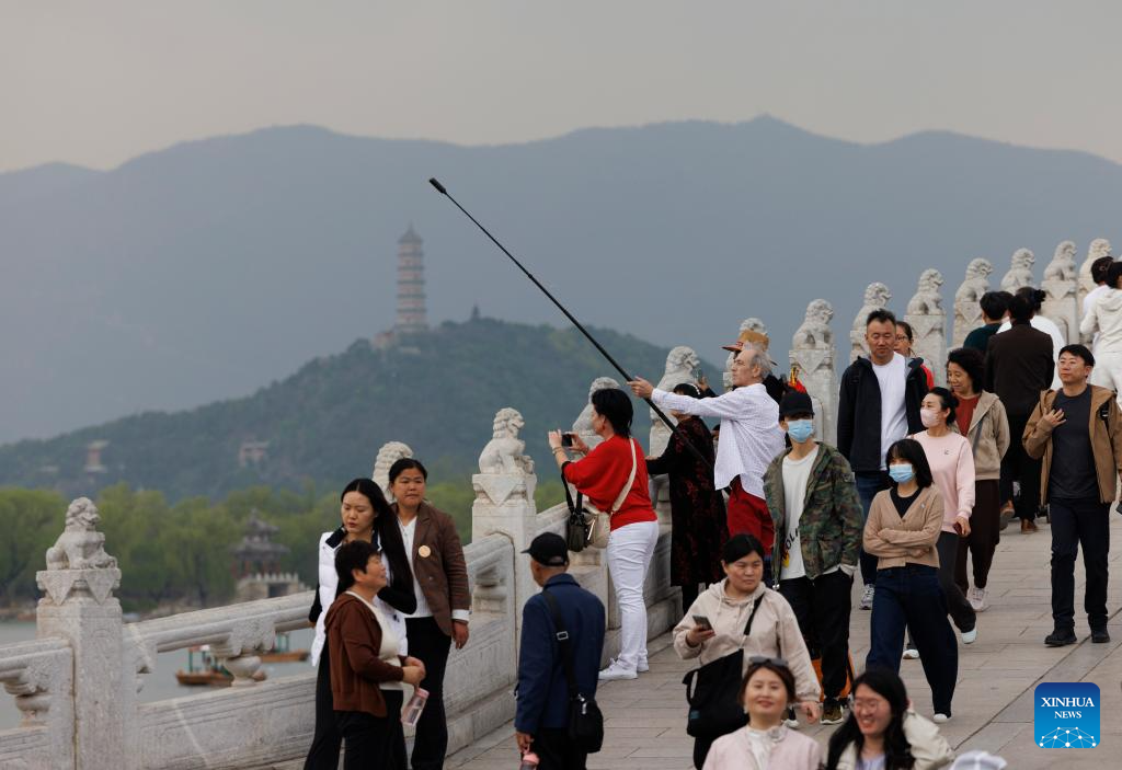 Visitors take photos at the 17-Arch Bridge in the Summer Palace in Beijing, capital of China, April 9, 2025.