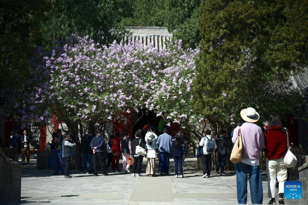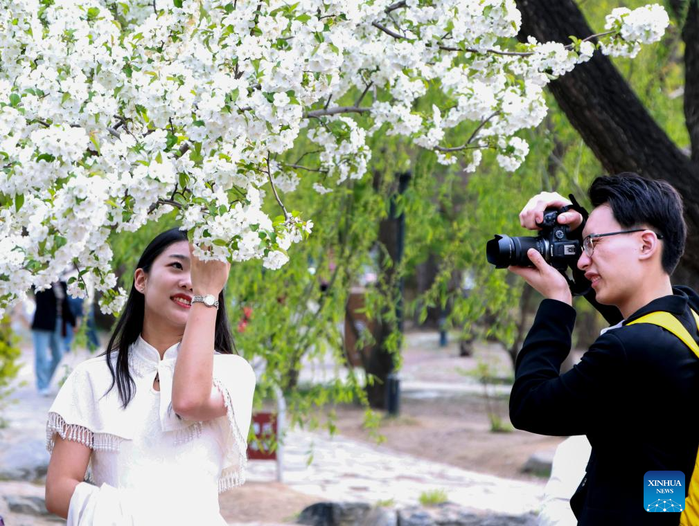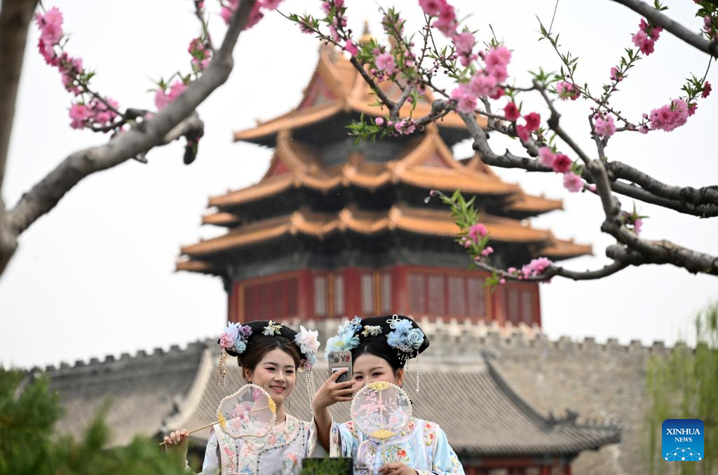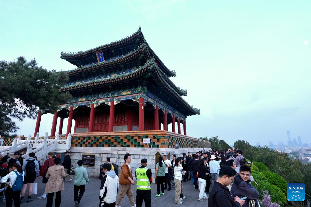 Visitors take photos at Jingshan Park in Beijing, capital of China, April 10, 2025.