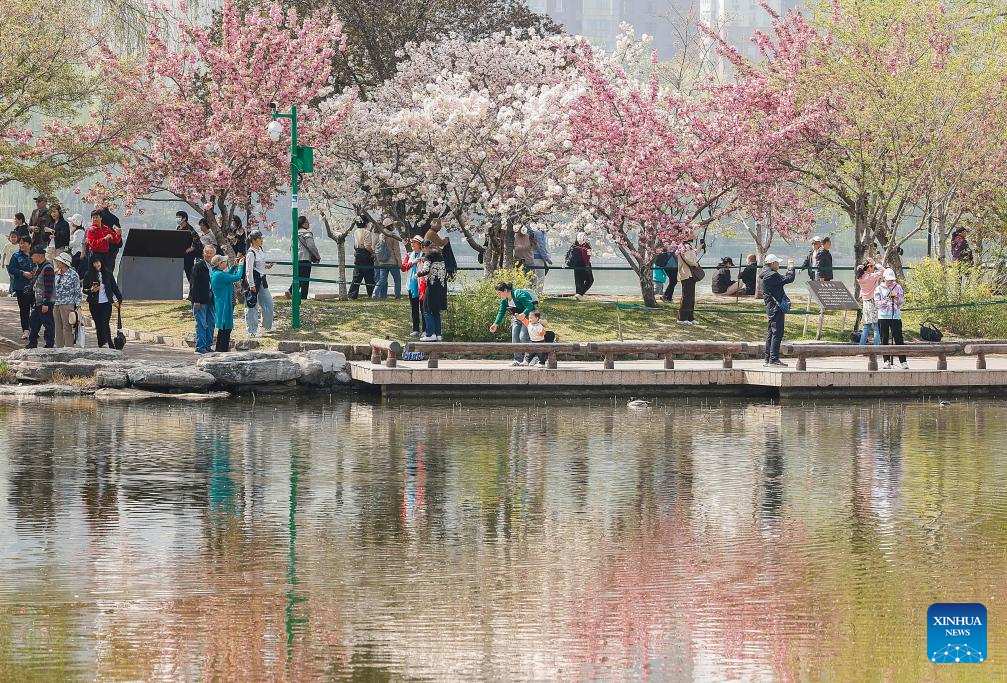 Visitors take photos of cherry blossoms at Yuyuantan Park in Beijing, capital of China, April 10, 2025.