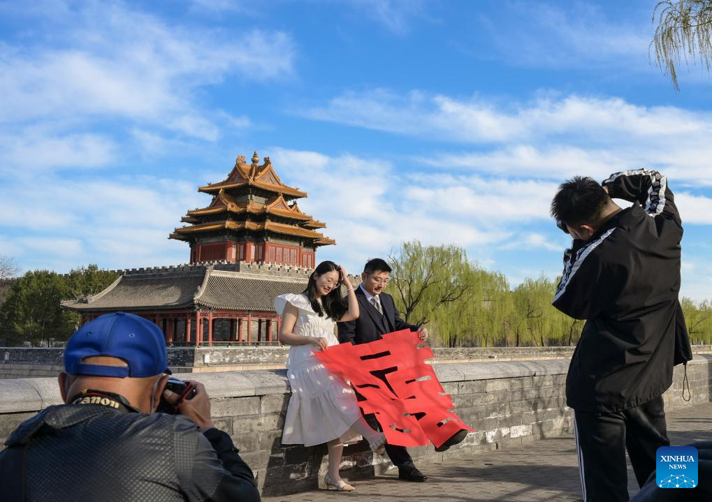 A couple pose for pre-wedding photos near a turret of the Forbidden City in Beijing, capital of China, March 25, 2025.
