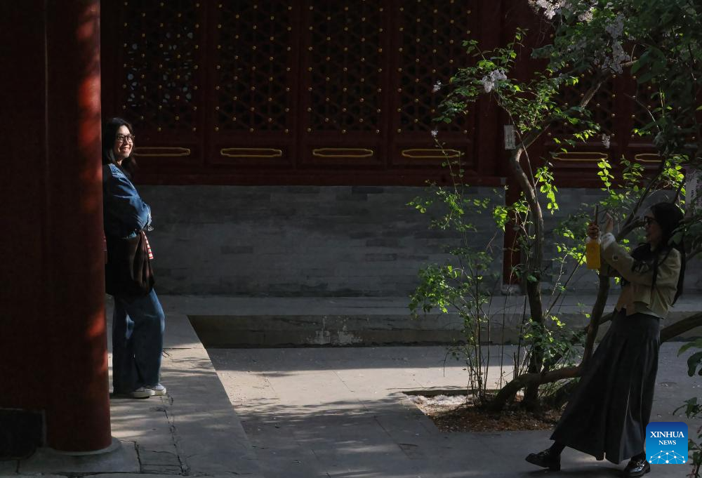 A visitor poses for photos at Fayuan Temple in Beijing, capital of China, April 10, 2025.