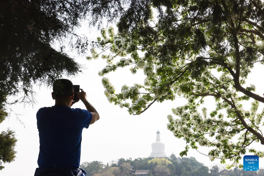 A visitor takes photos at Beihai Park in Beijing, capital of China, April 9, 2025.