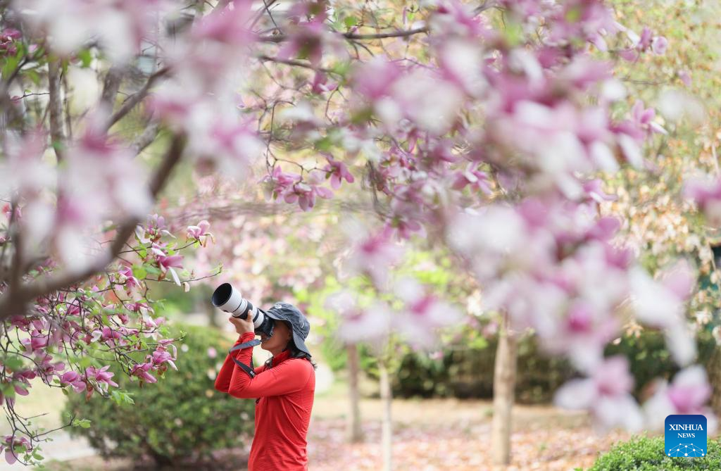 A photography enthusiast takes photos of magnolia blossoms at a park in Haidian District of Beijing, capital of China, April 8, 2025.