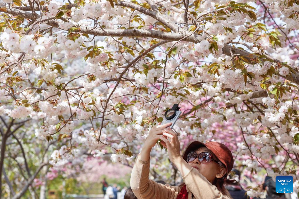 A visitor takes photos of cherry blossoms at Yuyuantan Park in Beijing, capital of China, April 10, 2025.