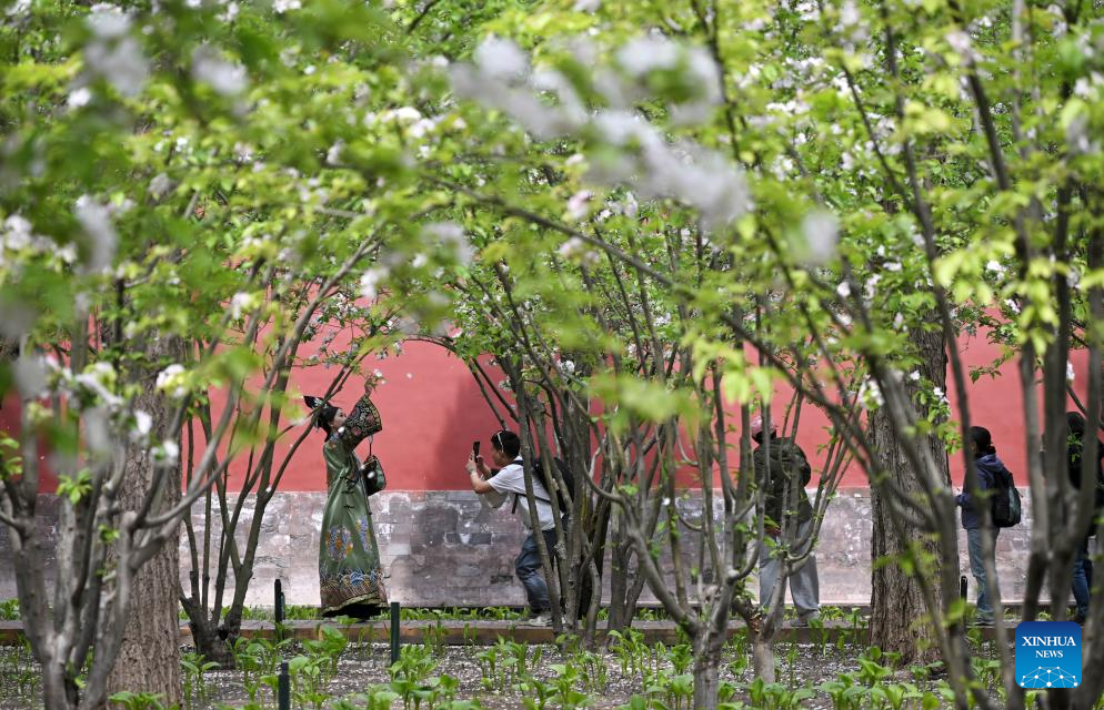 Visitors take photos amid crabapple blossoms at the Forbidden City in Beijing, capital of China, April 8, 2025.