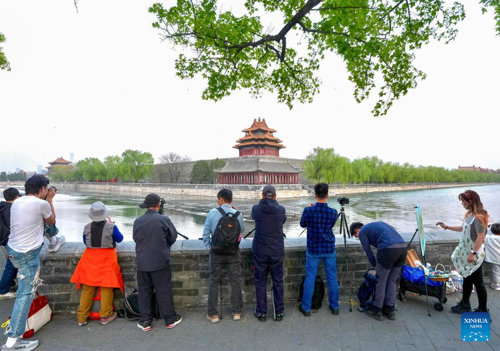 People draw pictures and take photos of a turret of the Forbidden City in Beijing, capital of China, April 10, 2025.