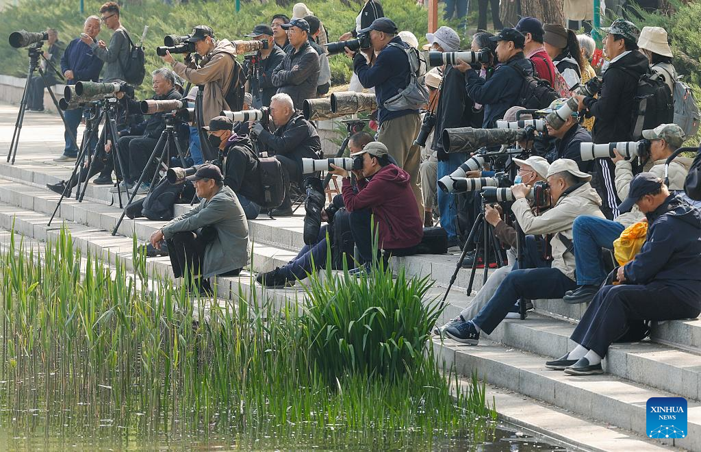 Photography enthusiasts take photos of waterbirds at Yuyuantan Park in Beijing, capital of China, April 10, 2025.