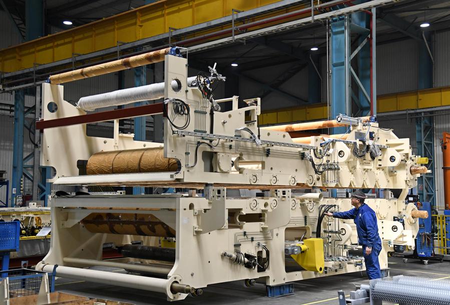 A staff member of Siempelkamp (Qingdao) checks a machine to be exported to Thailand in Qingdao, east China's Shandong Province, April 2, 2025. (Xinhua/Li Ziheng)
