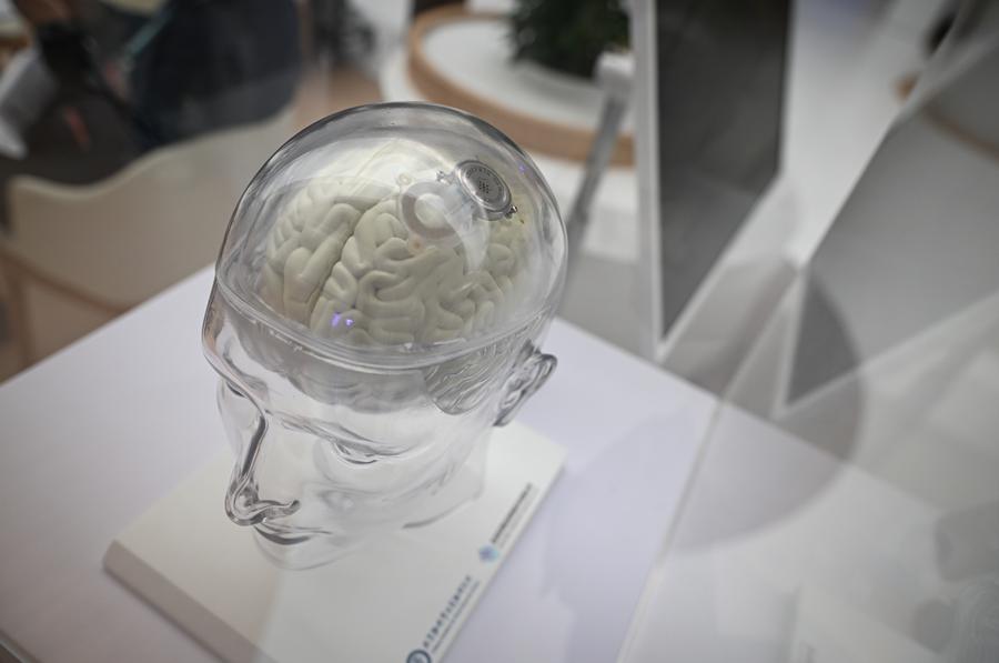 A model of a semi-invasive brain-computer interface is displayed at Zhongguancun International Innovation Center, venue for the 2025 Zhongguancun Forum (ZGC Forum), in Beijing, capital of China, March 26, 2025. (Xinhua/Chen Zhonghao)