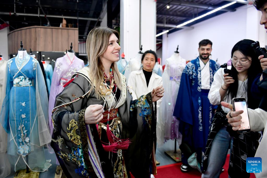 An Italian guest tries Hanfu at a Hanfu base in Caoxian County, east China's Shandong Province, April 8, 2025. (Xinhua/Guo Xulei)