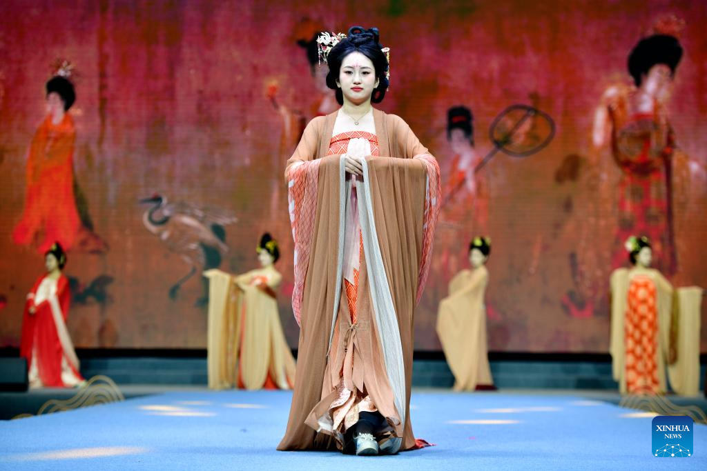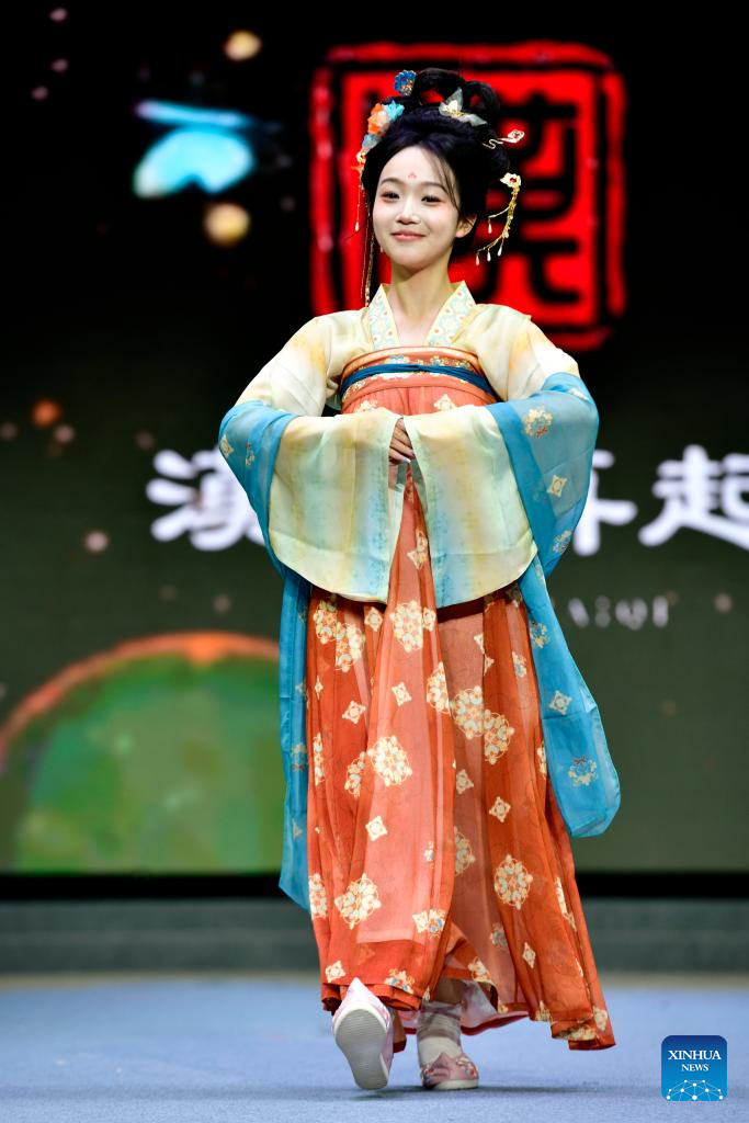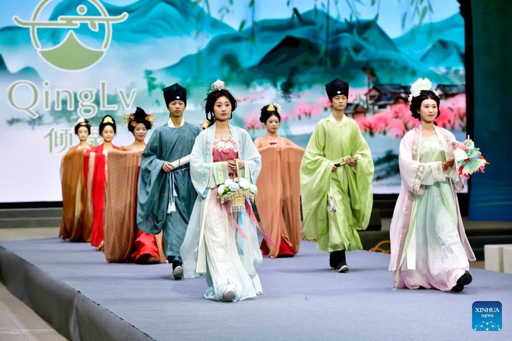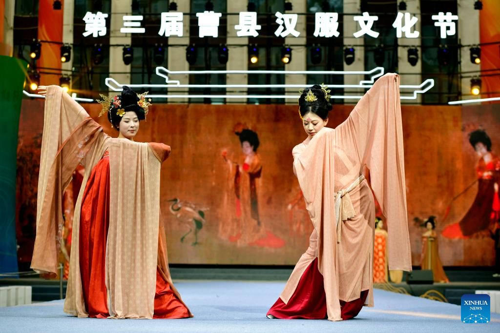 Models present Hanfu on the stage during a Hanfu launch event in Caoxian County, east China's Shandong Province, April 10, 2025.