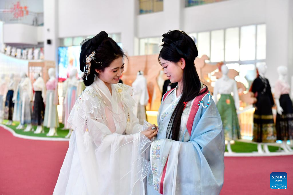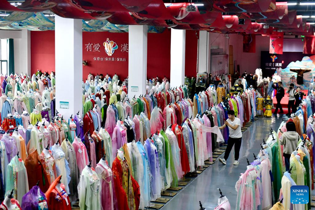 Caoxian County has developed a complete Hanfu industrial chain in recent years. At present, there are more than 2,700 Hanfu-related enterprises in the county. The total sales of Hanfu in Caoxian exceeded 12 billion yuan (about 1.6 billion U.S. dollars) in 2024. (Xinhua/Guo Xulei)