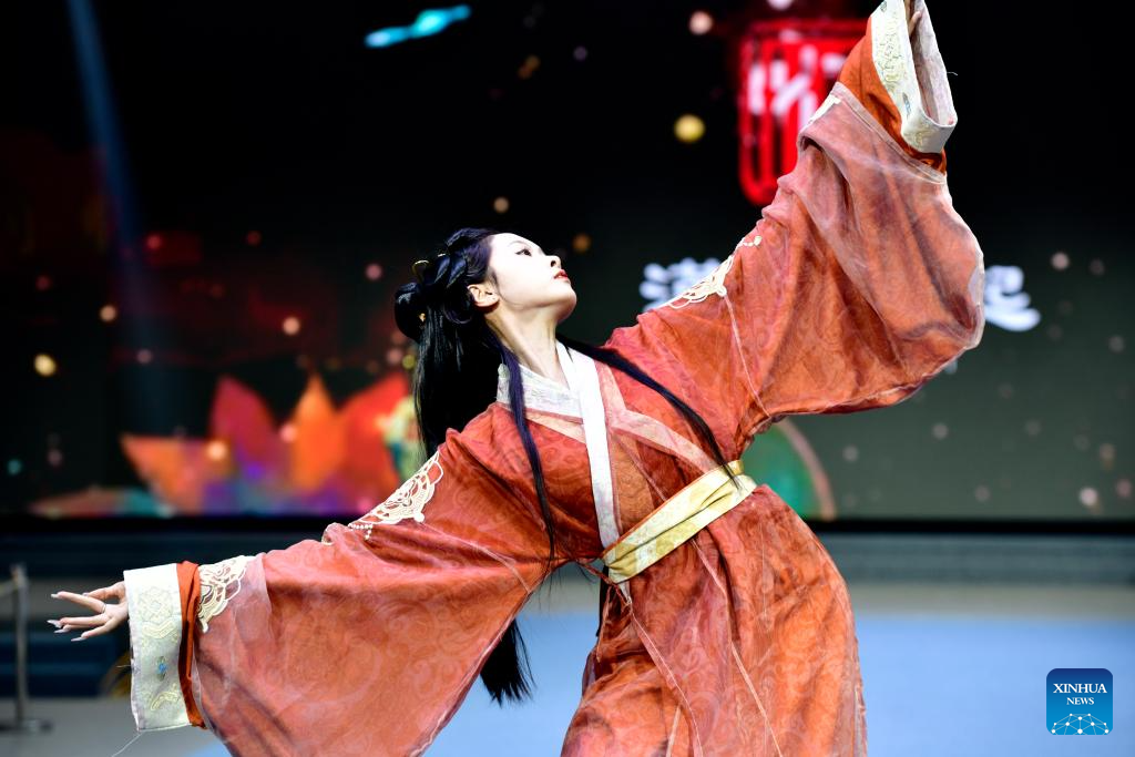 Models present Hanfu on the stage during a Hanfu launch event in Caoxian County, east China's Shandong Province, April 10, 2025. (Xinhua/Guo Xulei)
