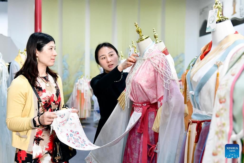 A staff member introduces Hanfu to a customer at a Hanfu base in Caoxian County, east China's Shandong Province, April 10, 2025. (Xinhua/Guo Xulei)