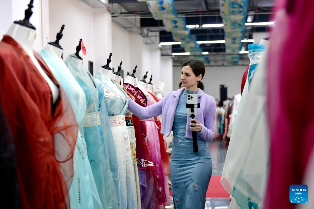 A Russian guest takes photos of Hanfu at a Hanfu base in Caoxian County, east China's Shandong Province, April 8, 2025. (Xinhua/Guo Xulei)