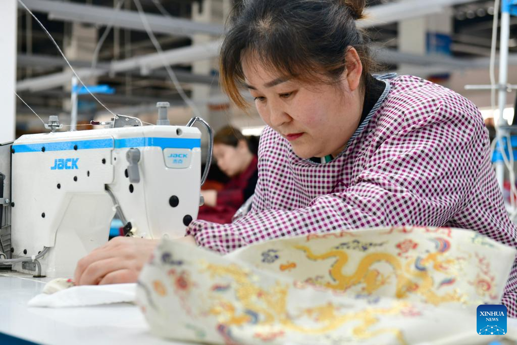 A staff member works at a Hanfu base in Caoxian County, east China's Shandong Province, April 10, 2025. (Xinhua/Guo Xulei)