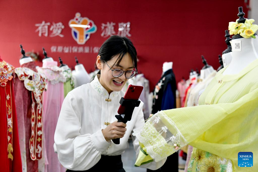 Staff members promote Hanfu via livestreaming at a Hanfu base in Caoxian County, east China's Shandong Province, April 10, 2025. (Xinhua/Guo Xulei)