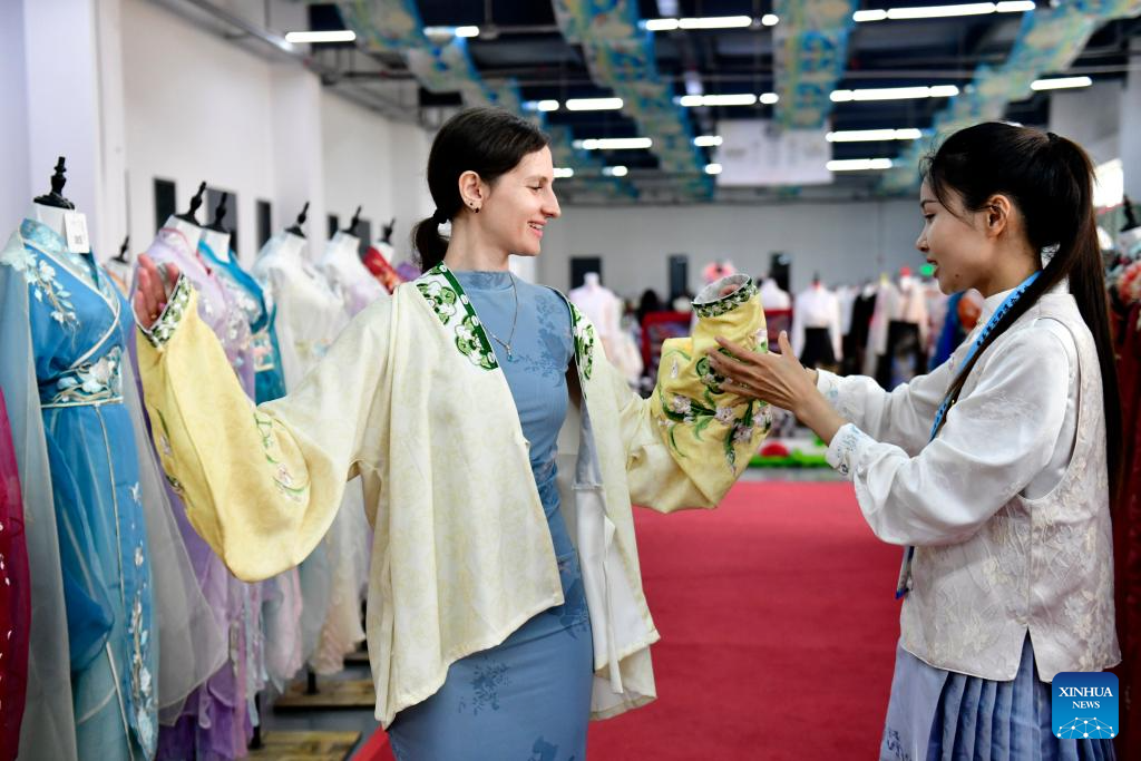 A Russian guest (L) tries Hanfu at a Hanfu base in Caoxian County, east China's Shandong Province, April 8, 2025. (Xinhua/Guo Xulei)