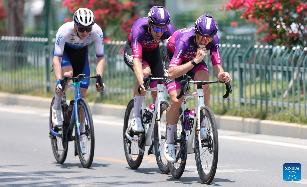 Karl Patrick Lauk of Quick Pro Team cools himself down during Stage 5 at the 16th Tour of Hainan cycling race from Dongfang to Sanya, south China's Hainan Province, April 11, 2025. (Xinhua/Yang Guanyu)