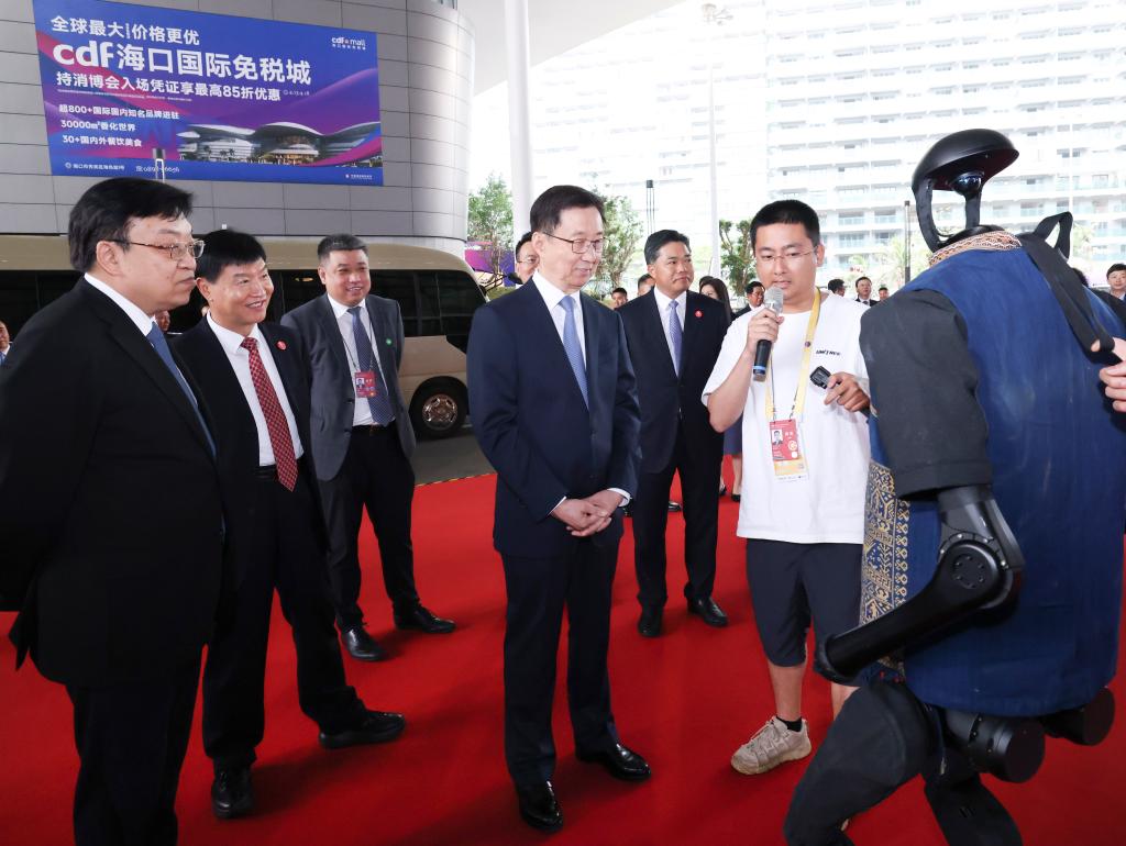 Chinese Vice President Han Zheng interacts with the representative of an exhibiting company before attending the launch event for the fifth China International Consumer Products Expo and "Shopping in China" series in Haikou, capital city of south China's Hainan Province, April 13, 2025. (Xinhua/Pang Xinglei)
