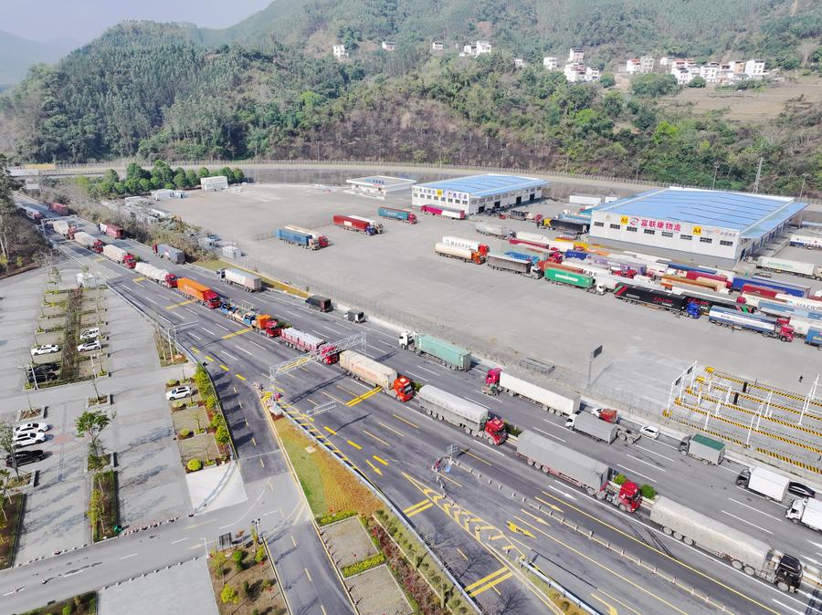 An aerial drone photo shows vehicles waiting to pass through Youyiguan Port, or Friendship Pass, in Pingxiang City, south China's Guangxi Zhuang Autonomous Region, March 1, 2025. (Xinhua/Zhou Hua)
