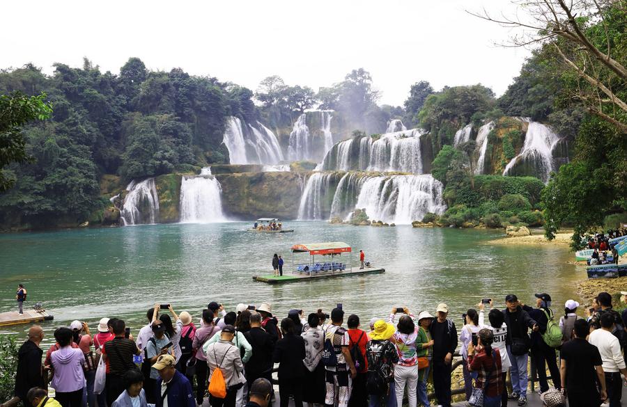 Tourists visit the Chinese part of the China-Vietnam Detian-Ban Gioc Waterfall cross-border tourism cooperation zone in Chongzuo, south China's Guangxi Province, Dec. 5, 2024. (Xinhua/Jin Haoyuan)
