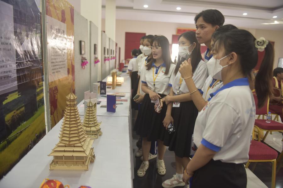 Students visit a Chinese and Cambodian cultural exhibition in Phnom Penh, Cambodia, Jan. 21, 2024. (Photo by Liao Hongqing/Xinhua)